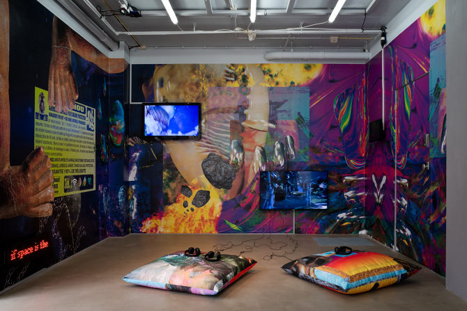 It’s been a pleasure to have produced Climate Knowledges with everyone at MAMA, and the artists, SF writer and activists, whose works remain presented in the space. If you walk by on Witte de Withstraat, you’ll still see the bright orange shelf that holds the Climate Visual Cultures Library; Annie Mackinnon’s soft painted sculptures beckoning like plants towards the light of the windows; Jessica El Mal’s collage hangings swaying to the gentle murmurs in the air, and Josèfa Ntjam’s densely animated and enveloping wall graphics that silently narrate her halted film installation. Science fiction writer Regina Kanyu Wang’s queer ecology story no longer sounds through the headphones or speakers onto the street, but like the sight of Climate Knowledges from the other side of its closed doors, you can sense how each piece resonates with the story it’s committed to tell.